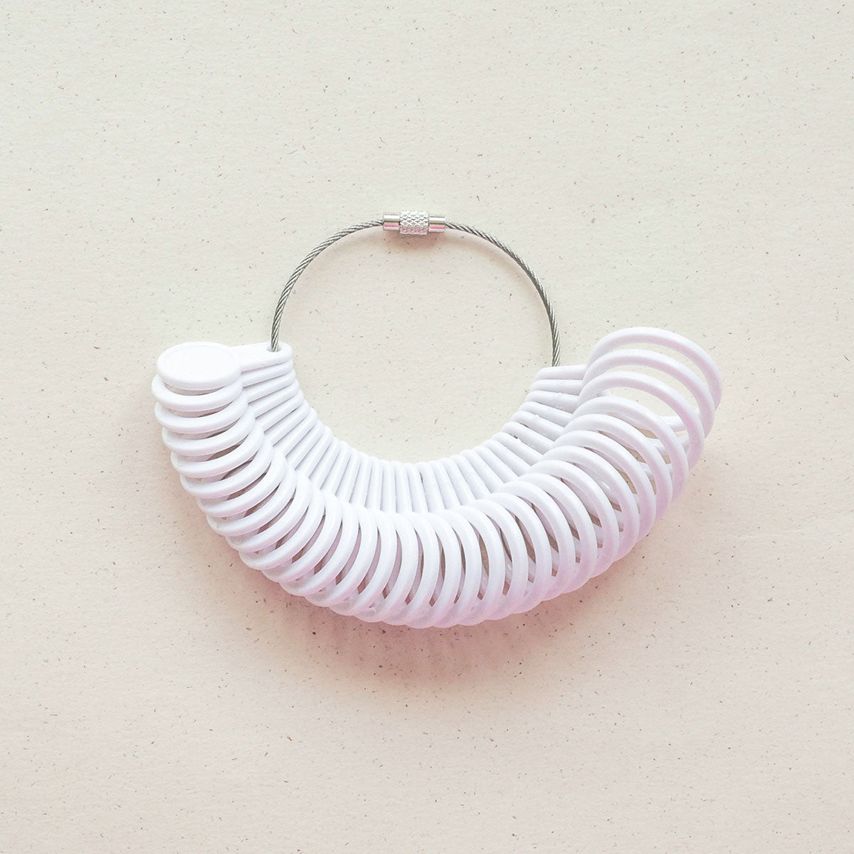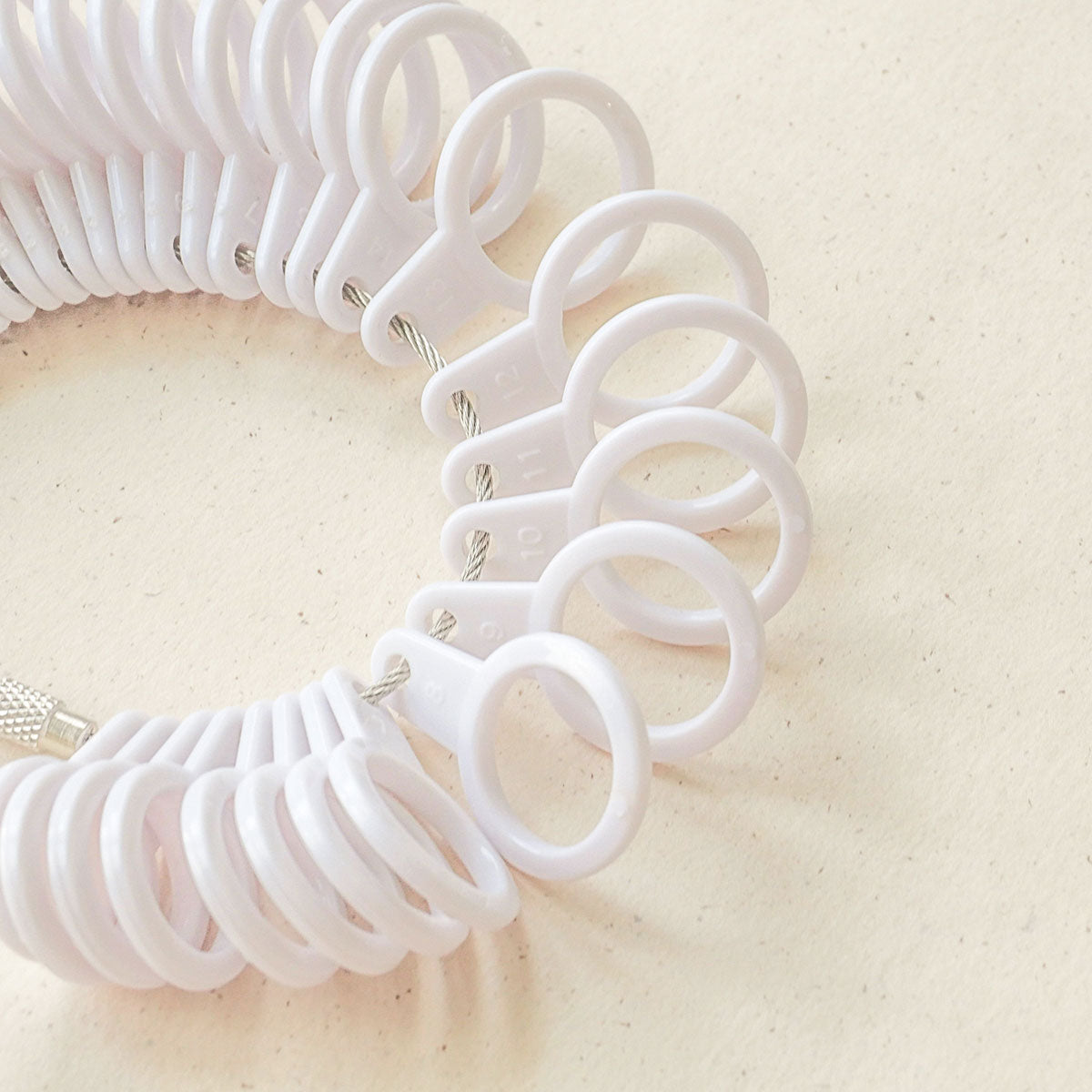 *The ring size measuring device is in increments of 1 size, but rings will be made in increments of 0.5 sizes. For example, if size 10 is too tight and size 11 is too loose, please order size 10.5.